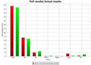 According to an internal poll conducted by the DA with American pollster Stan Greenberg in March–April 2014, the ANC would get 59% of the vote, the DA 26% and the EFF 8%.[76]