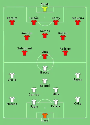 At full-time, the game was locked at 0–0. After a further 30 minutes of extra time, both sides were still scoreless.[23] This meant the match was the first final to end goalless and the first to be decided by penalty shoot outs.[24] Sevilla won the penalty shoot out 4–2, their goals coming from Carlos Bacca, Stéphane Mbia, Coke and Kevin Gameiro. Lima and Luisão scored for Benfica, while Sevilla goalkeeper Beto saved goals from Óscar Cardozo and Rodrigo.[23] Paul Gardner writing for Soccer America opined that the assistant referee standing on the goal line allowed Beto to advance too far when he saved the two goals and that Benfica should have been allowed to take the shots again.[25][26]