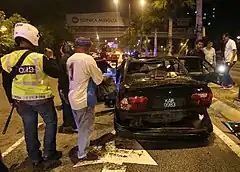 A policeman checking a Proton Wira damaged during the Low Yat riot.