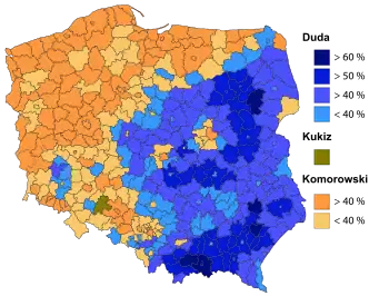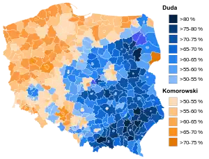 In the second round of the election on 24 May, Duda unseated Komorowski in what was until 2020 the closest presidential election since Poland became a democracy.[37][38] He defeated the incumbent by a margin of approximately three percentage points, according to official results.[39]
