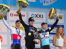 In late April Porte notched up his third overall win of the season, taking the Giro d'Italia warm-up Giro del Trentino four-day stage race.[59] Porte took a decisive stage victory on the queen stage summit finish to Brentonico[60] giving him a margin of 24 seconds over his closest rival, Mikel Landa. Porte would carry the majority of this gap to the finish in Cles.[61] The team then rounded off a successful April by taking victory in the Team Time Trial, by the scant margin of 0.63 seconds, at the Tour de Romandie, placing Geraint Thomas in the yellow leaders jersey[62]