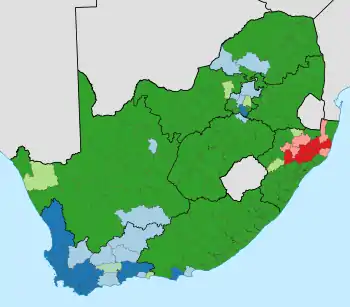 The ruling African National Congress (ANC) has been the majority party in most municipalities across South Africa, with the exception of those in the Western Cape, since 1994. Its overall share of the vote decreased slightly from 65.7% in 2006 to 62.93% in 2011 amid growing discontent regarding the state of the country's economy and perceived corruption within the organisation since the end of apartheid.[10] The party was led by Jacob Zuma, who was replaced by Cyril Ramaphosa at the 57th National Conference in December 2017.