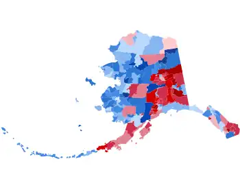 This is the first time since 1984 that a Republican won without Kusilvak Census Area, the first time since 1980 that they won without Nome, Yukon–Koyukuk Census Area, Northwest Arctic Borough, and Dillingham Census Area. The first since 1972 to win without North Slope Borough. The first ever to win without Aleutians West Census Area, Haines Borough, and Lake and Peninsula Borough.