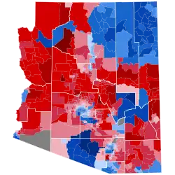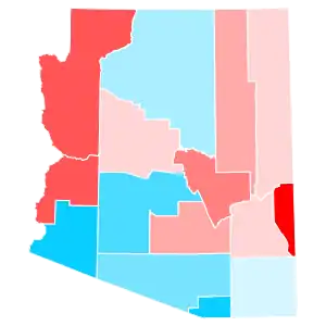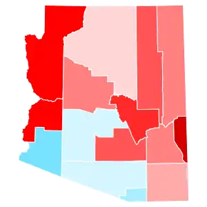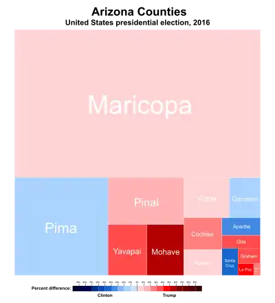 Donald Trump won Arizona with a margin of 3.5%, a reduced margin from Mitt Romney's 9.0% margin in 2012.[22] Arizona was among the eleven states in which Hillary Clinton outperformed Barack Obama's margin in 2012,[23] primarily due to an increase in Hispanic voter turnout in southern Arizona, including heavily populated Maricopa County. This was the weakest performance for a Republican in the state since 1992. Trump also lost the 2nd congressional district that Romney had won four years earlier.