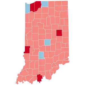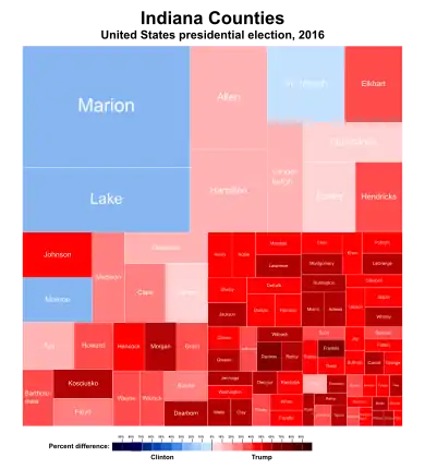Trump won the state with 56.47% of the vote, while Clinton received 37.46%.[3] Indiana is the home state of Pence, which was believed to have provided important assistance to the Trump campaign in what already would have been a Republican-leaning state.