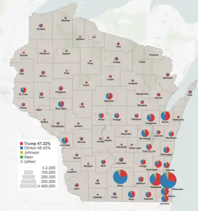 In the general election, Donald Trump unexpectedly won Wisconsin by a narrow margin of 0.77%, with 47.22% of the total votes over the 46.45% of Hillary Clinton. Wisconsin emerged as the tipping-point state in the 2016 election.