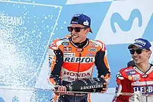 Marc Márquez, spraying the champagne on the podium after winning the MotoGP race. Next to him is Jorge Lorenzo, who finished third.