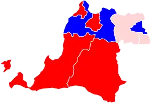 ![]() Results by regency/city. Regencies/cities won by Rano Karno are in red (■), while the ones won by Wahidin Halim are in blue (■). Lighter shades (■or■) indicate a winning majority of less than 5%. | ||||||||||||||||||||