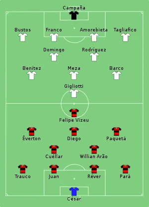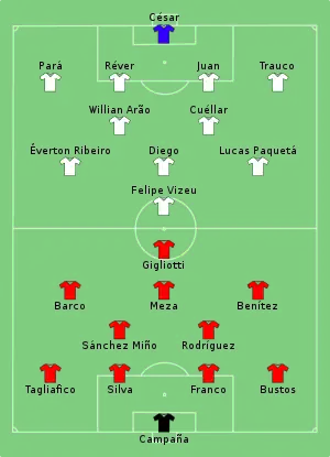 Flamengo scored after eight minutes when Réver headed a free kick from Trauco. Independiente equalized through Emmanuel Gigliotti, who combined with Benitez and finished a counter attack. Seven minutes after halftime, Barco crossed from the left side and Maximiliano Meza scored the winning goal with a right-footed volley.[6]