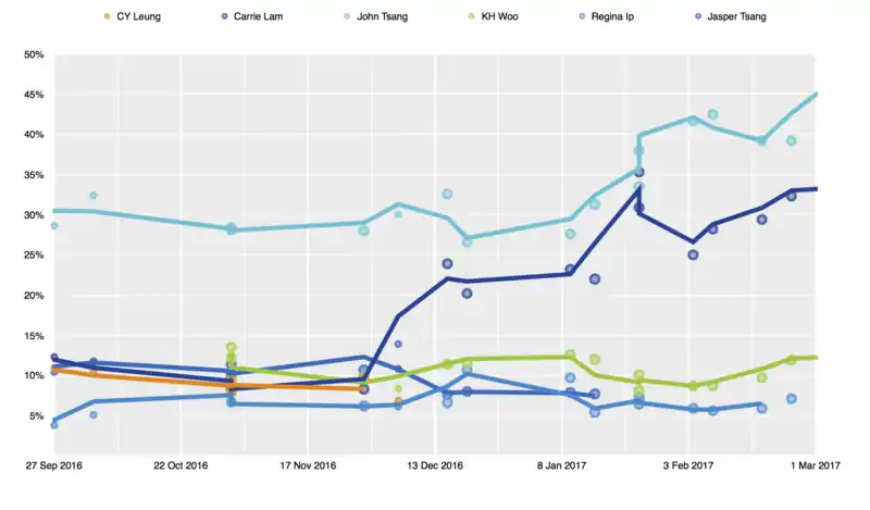 - ↑ "John Tsang backed by almost 92 per cent of voters in mock poll for Hong Kong's next leader". South China Morning Post. 19 March 2017.