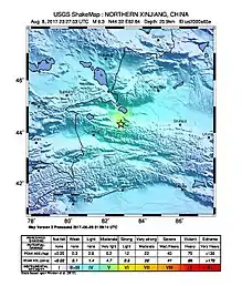 The 2017 Jinghe earthquake occurred at 07:27 China Standard Time (CST, UTC+8) on 9 August 2017, in Jinghe County, Bortala Mongol Autonomous Prefecture, Xinjiang Uyghur Autonomous Region, China, with magnitude 6.6 and depth 11 kilometres. The epicentre was 44°16′N 82°53′E / 44.27°N 82.89°E / 44.27; 82.89.[5] Most cities in northern Xinjiang felt the quake.[1][2] This earthquake occurred on the Tian Shan seismic zone. There was no direct relationship to the earthquake in Jiuzhaigou County that occurred the previous day.[6][7]