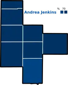 There were clear winners in several wards on election night. Green Council Member Cam Gordon (Ward 2), who did not have an opponent, won re-election. Other council members who won on election night include DFLers Lisa Goodman (Ward 7), Lisa Bender (Ward 10), Andrew Johnson (Ward 12), and Linea Palmisano (Ward 13). Ward 8 DFL candidate Andrea Jenkins also won, replacing retiring DFL Council Member Elizabeth Glidden. Wards which did not have a clear winner underwent several rounds of vote transfers on November 8.[46]