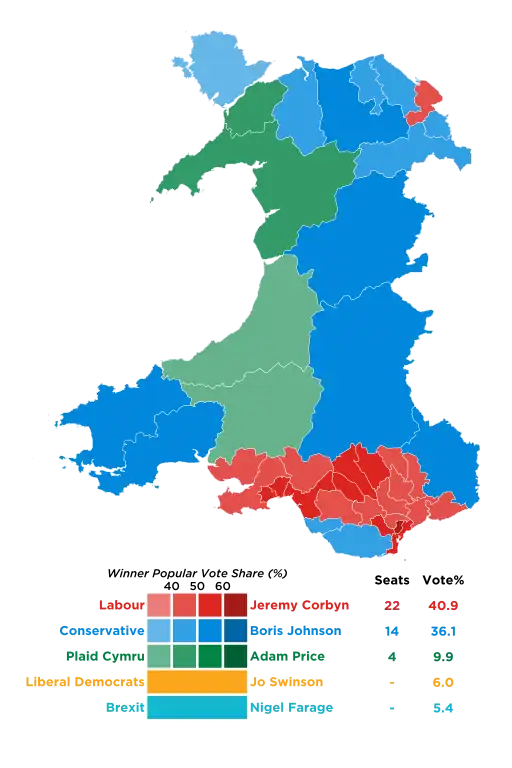 Compared to the 2017 general election, the Labour Party lost six seats, each of which was won by the Conservative Party. This reflected a decrease in vote share of 8% from the Labour Party, matched by increases in vote share for the Brexit Party and Conservative Party of 5.4% and 2.5%, respectively. However, the Labour Party remained the party receiving the most votes, with a 40.9% vote share. Having gained Brecon and Radnorshire in the 2019 Brecon and Radnorshire by-election earlier in the year, the Welsh Liberal Democrats lost to the Conservatives. Plaid Cymru retained its four seats. The party did not make any gains, and its total vote share was down 0.5%.
