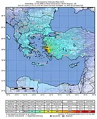 A USGS ShakeMap of the earthquake showing shaking based on Mercalli intensity scale at various locations in the East Aegean Sea.