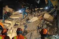 Most of the buildings that collapsed were built in the 1990s, based on outdated earthquake regulations from 1975. Poor construction practices and the absence of code compliance were reasons for the collapse.[81] The buildings that totally failed were typically between 5–10 storeys tall, and at least 30 years old.[82] Additionally, the first floors of these buildings were altered for commercial use such as shops. Taller buildings with heights of 100–240 m (330–790 ft), however, did not sustain structural damages. The city is also built on soft sediments in a basin which amplified the intensity of shaking despite its distance from the epicentre.[83]