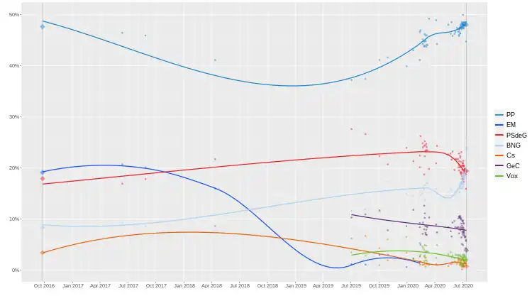 126. "GALICIA. Encuesta Sondaxe 26/01/2020: BNG 14,5% (11), EN MAREA 2,3%, GCE 11,8% (8), PSdeG-PSOE 21,3% (18), Cs 2,2%, PP 43,0% (38), VOX 1,9%". La Voz de Galicia (in Spanish). 26 January 2020. Archived from the original on 17 March 2020. Retrieved 26 January 2020.