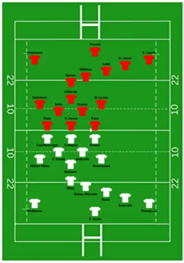 | 12:45 GMT (UTC±00:00) | Try: Hunter 4' c Dow 14' m Breach 27' m Fleetwood 40' m McKenna 59' m Con: Scarratt (1/5) 4' |