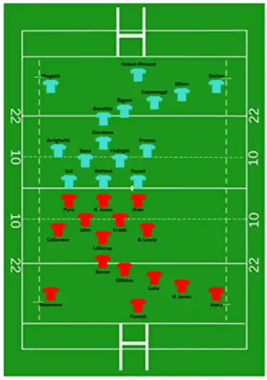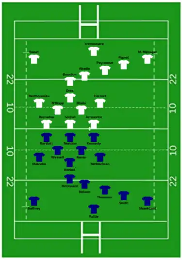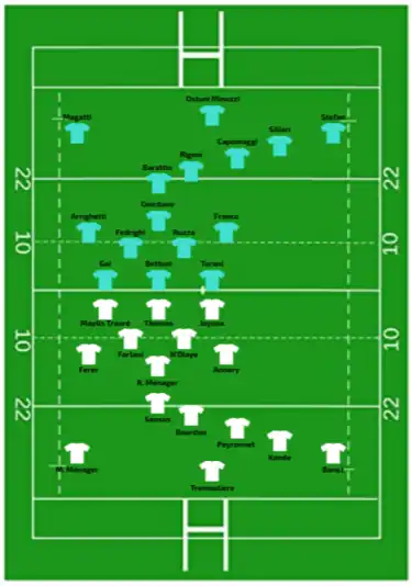 | 21:00 CET (UTC+01:00) | Try: Forlani 5' c Banet (2) 17' c, 32' c Annery 44' c Penalty try 78' Sansus 80' +1 c Con: Trémoulière (4/4) 6', 18', 33', 45' Bourdon (1/1) 80' +2 Pen: Trémoulière (1/1) 12' |