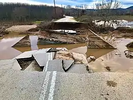 In the morning hours of 12 January 2021, the village of Mikro Dereio was flooded and evacuated. Many houses including the central square of the village were flooded and local authorities were present in the area for hours.[5] Residents managed to get inside the village church to save themselves.[6] Schools in Mikro Dereio were closed on the spot.[7] At the same time, an iron bridge was destroyed by the water pressure in the village Loutra near Alexandroupoli. The bridge used to connect the two sides of the village. Warning signs were placed by the authorities of the Municipality of Alexandroupoli.[8]