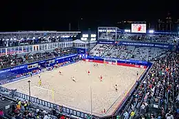 Construction of the temporary structure began on 5 July 2021, at the "Festival Square" area of the complex, outside the front of the Luzhniki Stadium; it was reported as complete on 12 August.[43] 2,000 tons of artificial quartz sand was imported to create the playing surface. It was tested by a specialist laboratory in Canada which compared it favourably to the consistency of natural sand found on Copacabana beach in Rio de Janeiro, Brazil. The sand features a special coating to ensure it maintains its usual viscosity in the event of rain.[44]
