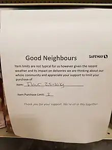 Public concern over these extensive disruptions to the supply chain led to panic buying across the Lower Mainland[96][97][98] and the Okanagan.[99][100]