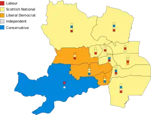 At the previous election in 2017, the Scottish National Party (SNP) won the most seats on the council for the first time. The SNP gained four seats to hold 19, four shy of an overall majority, while Labour lost eight seats, which left them with nine as they fell from the largest party to third place. The Conservatives gained eight seats to record their best result in Aberdeen since 1980 with 11 seats, while the Liberal Democrats lost one seat to hold four. Two independent councillors were also elected.[1][2]