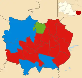The council elects its councillors in thirds, with a third being up for election every year for three years, with no election in the fourth year.[7][8] The election will take place by first-past-the-post voting, with wards being represented by three councillors, with one councillor elected in each ward each election year to serve a four-year term.