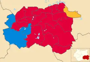 Since its first election in 1973, Labour has always controlled Wakefield Council, only falling below 60% of seats on 4 occasions (most recently in 2010).[2] In the 2021 election, Labour lost 6 seats with 45.1% of the vote, the Conservatives gained 6 seats with 37.5%, the Liberal Democrats gained 1 with 3.0%, and independents lost 1 with 2.1%