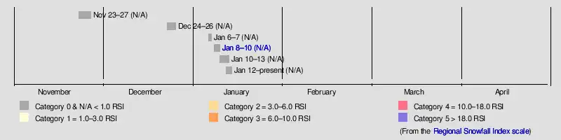 A winter storm, unofficially named Winter Storm Ember by The Weather Channel, that later became a nor'easter, affected the Northeastern United States from January 6-7, 2024. Multiple locations in several states, including New Jersey, Pennsylvania and Connecticut recorded 1 foot (30 cm) of snow. 13,000 customers also lost power in Massachusetts.[21] The storm also ended the longest stretch without measurable snow in Harrisburg, Pennsylvania and the longest stretch without 1 in (2.5 cm) of snow in State College, Pennsylvania.[22] Portions of the Massachusetts Turnpike closed due to snow.[23] In addition, planned construction along the New York Thruway between Orange County and Ulster County was postponed by a week.[24] Despite over 1 ft (30 cm) of snow in Port Jervis, New York, the record snow drought in New York City continued, as Central Park only picked up 0.2 in (0.51 cm) of snow.[25] Boston measured 3.8 in (9.7 cm) during the snow event, with 5.6 in (14 cm) of snow in Providence, Rhode Island and 10.4 in (26 cm) of snow in Hartford, Connecticut.[26]
