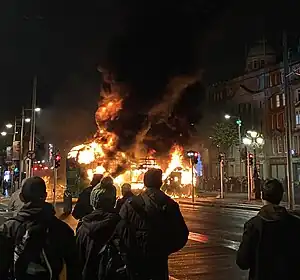 By 5 pm, a crowd had gathered at the top of O'Connell Street, near the scene of the stabbings, some carrying the flag of Ireland or placards with anti-immigration slogans such as "Irish Lives Matter".[37][39] Around 6 pm, the crowd of between 100 and 200 people,[5] was joined by youths carrying metal bars and wearing facial coverings (including balaclavas and hoods).[40][41] A small number of people were reported to be shouting anti-immigration slogans at gardaí.[32] Members of the crowd began throwing fireworks, flares and bottles at the gardaí who were maintaining a cordon at the crime scene.[10] Vehicles were vandalised and set on fire, including Garda vehicles, buses, and a Luas tram.[5] Shops and businesses were looted and set on fire.[42] At the peak of the riot, the crowd grew to about 500 people and spread to Capel Street and Parliament Street.[11][43] Members of the Garda Public Order Unit were deployed to the area.[44] A witness described the rioters as "young people—late-teens, early-20s" who were being "egged on" by older people.[45] By this point, social media users on Telegram encouraged rioters to target foreigners, stating to "kill everyone you come across."[46]