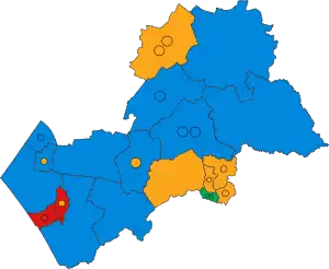 The Conservative Party lost control of the council after losing seven seats in the election.[6][7] After the elections the Conservative leader Phil King resigned.[8] A joint Liberal Democrat, Labour and Green administration took power at the first meeting of the newly elected council on 15 May 2023, with Phil Knowles becoming Leader.[9]