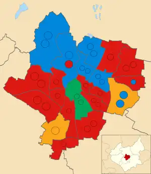 ![]() Winner of each seat at the 2023 Leicester City Council election | ||||||||||||||||||||||||||||||||||||||||||||||||||||||||||||||||||||||||||||||||||