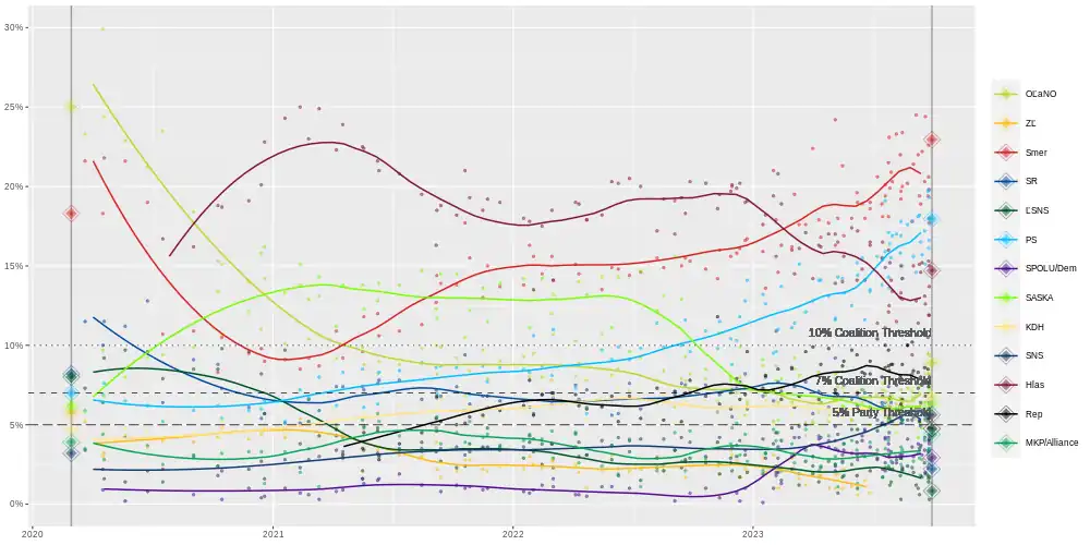 The left-wing populist and social conservative, Direction – Social Democracy (Smer-SD), led by former Prime Minister Robert Fico, emerged as the largest party, winning 42 seats. The social-liberal and pro-European, Progressive Slovakia (PS) came in second, with 32 seats. Former Prime Minister Peter Pellegrini's social-democratic, Voice – Social Democracy (Hlas-SD), which split from Smer-SD in 2020, came in third with 27 seats. The Liberal, OĽaNO and its allies won 16 seats, less than a quarter of their total in the 2020 election. The Christian-democratic, Christian Democratic Movement (KDH) and the right-wing populist, Slovak National Party (SNS) re-entered the National Council after failing to achieve the vote threshold in 2020, winning twelve and ten seats respectively. The classical liberal, Freedom and Solidarity (SaS) won eleven seats, tying the 2012 election as their worst result since the party's founding.[3]