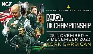 The 2023 UK Championship (officially the 2023 MrQ UK Championship) was a professional snooker tournament that took place from 25 November to 3 December 2023 at the York Barbican in York, England. The 47th edition of the UK Championship, first held in 1977, it was the eighth ranking event of the 2023–24 snooker season, following the International Championship and preceding the Snooker Shoot Out. It was also the season's first Triple Crown event, preceding the Masters and the World Championship. Organised by the World Snooker Tour and sponsored by online casino MrQ, the event was broadcast by the BBC domestically, by Discovery+ and Eurosport in Europe, and by other broadcasters worldwide. The winner received £250,000 from a total prize fund of £1,205,000.
