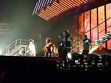 On September 9, 2006, Jackson went to France to perform "So Excited" at NRJ's Back to School concert, along with past single "Nasty".[43] While on The Oprah Winfrey Show, she was interviewed and performed both tracks again. The show aired on September 25.[44] Jackson held an album signing in Times Square at the Virgin Megastore on September 26, the album's release date.[45] Jackson performed live on the Today show — as part of their Concert Series — three days later.[46] In October, she traveled to Japan to promote the album and wore a red kimono during a press conference there.[47] In November, Jackson performed on The Ellen DeGeneres Show,[48] while she was interviewed on The Tyra Banks Show to further promote the album.[49] On December 4, the singer opened the 2006 Billboard Music Awards with a medley of "The Pleasure Principle" and "So Excited".[50][51] During rehearsals for the awards two days prior, she taped a performance featuring two classic singles from her catalog, "Nasty" and "Let's Wait Awhile", which was streamed on American Express' website.[52]