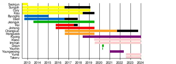 On November 2, Choeun Entertainment made a statement confirming that as of July 6, 2017, Hui had officially left the group, it was also confirmed that Daeil was no longer a member, and that Sungoh's future with the company is to be discussed after he completes his mandatory military service. The remaining six members participated in the JTBC's Survival show Mix Nine.[15]