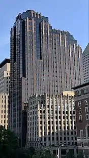 300 North Meridian is a high rise in Indianapolis, Indiana. Construction started in 1987, financed by Browning Investments. The architects, Haldeman Miller Bregman Hamann (now BOKA Powell), built the outside with brownish-reddish granite and black windows, and capped the skyscraper with a copper-colored dome. Only the eastern side rises to the full height of the building; the northern and southern sides rise in a staircase shape toward the east. The architects intended 300 North Meridian's design to echo the adjacent Chamber of Commerce building.[3][4] It was completed in 1989 and is currently the fifth-tallest building in the city.