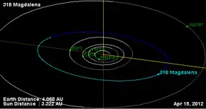 Magdalena (minor planet designation: 318 Magdalena) is a main belt asteroid orbiting the Sun. It was discovered by Auguste Charlois on 24 September 1891 in Nice. It may be named for Mary Magdalene, who in legend travelled to Southern Gaul and is the patron saint of Provence.[3]