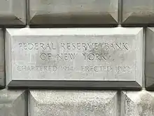 . - ↑ "Lay Cornerstone For New Home of N. Y. Reserve Bank: Ceremonies Simple; Governor Strong Dedicates New Building to Service of People of Our Country". New-York Tribune. June 1, 1922. p. 17. ProQuest 576615818. Retrieved February 18, 2021 – via ProQuest.