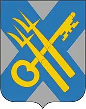 Shield: Argent on a saltire celeste a key ward up bendwise sinister surmounted by two pikes bendwise Or.