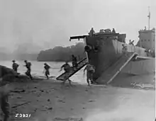 The embarkation was undertaken in two waves. 'C' and 'D' Companies boarded Landing Craft Infantry (LCI) vessels at Kukrum early on 25 October, while 'A' and 'B' Companies boarded High speed transports (known as APDs) the following day.[33] In the early hours of 27 October, following a naval bombardment of the Japanese positions around the village of Falamai on the southern coast of Mono Island[34] the 36th Battalion went ashore on the left flank of the 29th Battalion.[35] 'A' and 'B' Companies landed unopposed to the west of Falamai in between the Saveke River and Cutler's Creek[29] at 6:26 am and after organising themselves on the beach, they advanced inland in order to vacate the beach for the 'D' Company, which came ashore in the second wave at 6:46. While these forward companies moved inland, 'C' Company began the task of unloading stores on the beachhead. This was completed within 20 minutes.[34]