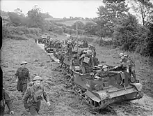 After Dunkirk, the battalion left the 23rd Division on 29 June 1940.[6] It was under command of Home Forces until November 1940 when it joined the 3rd Infantry Division, a Regular Army formation,[8] as a motorcycle battalion. The battalion was one of only two Territorial Army units in the division, the other being 76th (Highland) Field Regiment, Royal Artillery. On 30 April 1941 it was transferred to the Reconnaissance Corps and redesignated as 3rd Battalion, Reconnaissance Corps; then on 6 June 1942 as 3rd Regiment, Reconnaissance Corps (NF); and finally on 1 January 1944 it was transferred to the Royal Armoured Corps as 3rd Reconnaissance Regiment (NF).[9] It remained part of the 3rd Infantry Division until August 1945.[10]