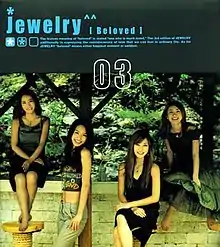 In 2003, Jewelry returned to their previous "cute" concept, but less emphasis on the cuteness, unlike the first album. The group performed their comeback performance in June 2003, performing the lead single, 니가 참 좋아 (I Really Like You), and Be My Love. The album consists of pop songs, departing from the R&B ballad sound they once excelled in. The lead single, 니가 참 좋아 (I Really Like You), is a song about strong affection for another person, and was very popular upon its release, charting high on the charts and was performed frequently. The music video contained all four members unknowingly trying to get the attention of one guy, only to find out that he is interested in another girl.[1] Another single was released, 바보야 (Fool), a song about a girl who adores a guy, but the guy is too oblivious to her feelings. The music video is a montage consisting of footage during promotion of Beloved.[2] Despite being the second single, the song was never performed live. Be My Love was also promoted, and ended up being a popular song from the album, and was performed live many times (altered from the album version, also known as the TV version, including a dance break performed by Seo In Young). Beloved was a great seller, but Jewelry was unhappy with their current image, and wanted to break out of their "cutesy" concept.