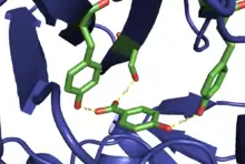 The substrate binds in the active site of the enzyme via non-covalent interactions with proximal amino acid side chains. Specifically, the hydroxyl groups of tyrosine 201 and 222, in addition to the hydroxyl group of serine 212, interact with the carboxylate and hydroxyl group on the substrate. This allows for proper orientation within the active site in order to achieve reactivity.[2]