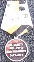 2013 (MMXIII) was the year of the 400th Anniversary of the founding of the House of Romanov, Russia's Imperial dynasty. At the date of this anniversary, a number of events were organized on the occasion in Russia and Ukraine marking a grand jubilee[1] in their history. The celebration marks the accession of Mikhail Fyodorovich Romanov (Russian: Михаи́л Фёдорович Рома́нов) to the Russian throne on 11 (21) June 1613 beginning a new ruling dynasty of the Romanovs. The rule of dynasty ended with the abdication of Nicholas II in March 1917. The medal is awarded in three classes: gold, silver and bronze.