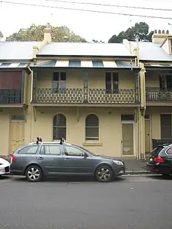 A simple well-proportioned two-storey Victorian terrace house with four bedrooms. Features include a cantilevered balcony over footpath, a corrugated iron verandah painted in wide stripes, two french doors on upper storey, panelled front door with fanlight and two sash windows with slab sills on ground floor. Storeys: Two; Construction: Painted rendered masonry. Corrugated galvanised iron roof. Timber balcony structure and cast iron column supports for verandah roof. Iron lace balustrading. Style: Victorian Filigree.[1]