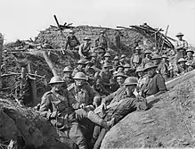 After arriving in France on 11 June 1916, the battalion was committed to the fighting, moving up to front on 28 June.[5] Its first major action came during the Battle of Mouquet Farm during August and September, during which the 50th suffered over 400 casualties.[6] Following this, it saw service attacking the Hindenburg Line in 1917. During actions at Noreuil on 2 April of that year, Private Jørgen Jensen performed the deeds that led to him being awarded the Victoria Cross (VC). Later in the year the 50th Battalion participated in the battles at Messines and Polygon Wood.[4] At Messines, the 50th were initially used to provide carrying parties for the assault, before launching an attack around Blauwepoortbeek late on 9 June. Lacking artillery support, the attack was held up when it came up against uncut wire entanglements and machine guns. A scheduled relief was cancelled and second effort was made the following morning, this time with artillery support, and this succeeded in gaining part of the Oosttaverne Line.[7] The Australians were relieved on 11 June, but before this took place a patrol from the 50th helped soldiers from the British 11th Division occupy Delporte Farm.[8] In late September, during the fighting around Polygon Wood, the battalion took part in the 13th Brigade's attack against the Tokio Spur. Advancing towards Molenaarelsthoek, the attack proved successful and subsequently held the line against a German counterattack that was broken up by defensive artillery and machine guns.[9] The battalion's losses around Polygon Wood amounted to 221 killed or wounded.[10]