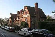 The dwellings had been built in the early 18th century, or earlier. They were refaced and partly rebuilt for Rowland Egerton-Warburton of Arley Hall, the architect being John Douglas.[1] The work was carried out around 1870,[2] or just before 1875.[1] It was part of Egerton-Warburton's "campaign to restore the village and render it picturesque in Victorian eyes".[3] The two outer buildings are houses and the two central buildings are cottages. They are built in brown brick with clay tile roofs, and have two storeys plus attics. Each building has a gable, those on the outer buildings being larger than those on the inner buildings, and all are decorated with brick and plaster.[1]