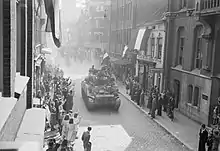 The German front began to break up at the end of July. Guards Armoured was deployed to support II Canadian Corps's Operation Spring on 25 July but did not get into action.[35][36] It was then shifted west as British Second Army began its move south (Operation Bluecoat) on 30 July. On the afternoon of 31 July Guards Armoured was ordered out of its assembly points north of Caumont to advance on 11th Armoured Division's flank. By evening it was in contact with the enemy south-east of St Martin and next day, despite traffic jams, it secured its objectives after some hard fighting. The advance lost impetus, with hard fighting round Arclais and Estry, but by 11 August the division was pushing its way south from Vire. The Germans pulled out on 16 August and Guards Armoured Division went into Second Army reserve.[37][38][39][40][41][42]