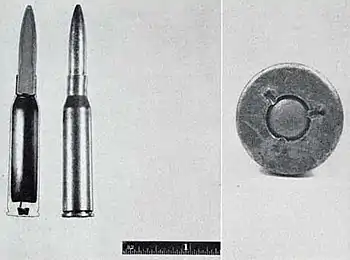 The 6.5 mm Japanese round was later criticized as being under-powered in comparison to other contemporary military cartridges such as the .30-06, .303 British, 7.92×57mm Mauser, and 7.62×54mmR.[3] For this reason, it was gradually replaced by the more powerful 7.7×58mm cartridge in 1938. Both cartridges were used until the end of the war, which created difficulty in supplying Japanese forces with the appropriate ammunition. Because of the long barrel of the Type 38 rifle, one benefit of the 6.5 mm round was that it produced very little muzzle flash and smoke.[3] Furthermore, the 6.5 mm round with the Type 38 spitzer bullet had a desirable flat trajectory, and effective terminal ballistics with rapid yaw on impact causing severe wounds. Larger caliber military cartridges are also optimal for machine guns to use for long-range firing, and rifles were often only made to chamber them in the interest of logistics. Japan had the 7.7 mm cartridge in use only by machine guns for years before developing a rifle for the round.[4]